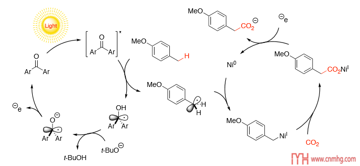 以一篇JACS為例,這篇文章開發(fā)了芐基和脂肪族C-H鍵與CO2的光誘導羧化反應。甲苯衍生物在芳族酮,鎳配合物和叔丁醇鉀的存在下用紫外線照射時,會在芐基位置捕獲氣態(tài)CO2,從而生成苯乙酸衍生物。(如圖 1所示)