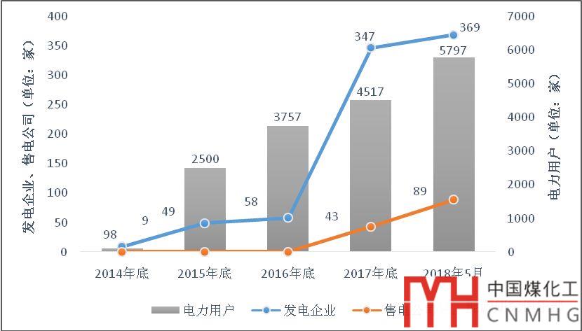 從參與交易的主體數(shù)量來看,通過有效的激勵機(jī)制,吸引發(fā)電企業(yè)、電力用戶等市場主體積極參與市場交易。如圖1所示,截至2018年5月,在云南電力市場中注冊的發(fā)電企業(yè)369家,電力用戶5797家,售電公司89家,主體規(guī)模是2015年的2.5倍。