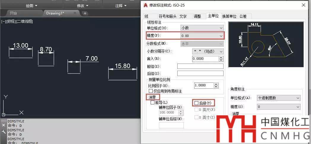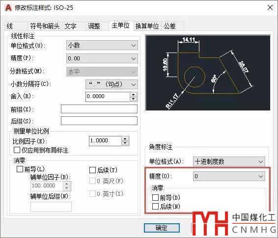 上面說的精度、舍入、消零都是針對線性的標注的,角度標注也有精度和消零的設置,但沒有舍入的設置,如圖所示。