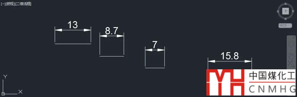 1、開一張空圖,繪制幾條直線,長度可以是13、8.7、7、15.8等隨意的數(shù)值,然后輸入DLI,用默認的標注樣式在給這些直線標注上尺寸, 如圖所示。
