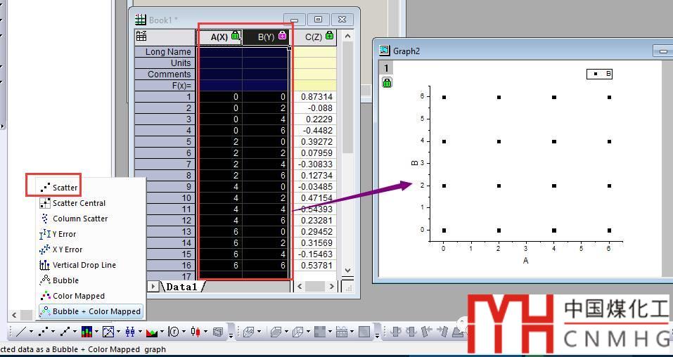 使用轉(zhuǎn)換得到的XYZ數(shù)據(jù),選擇前兩列XY,繪制Scatter圖