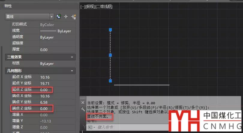 兩條直線的Z坐標(biāo)都是0,怎么在倒角的時(shí)候卻提示不共面?