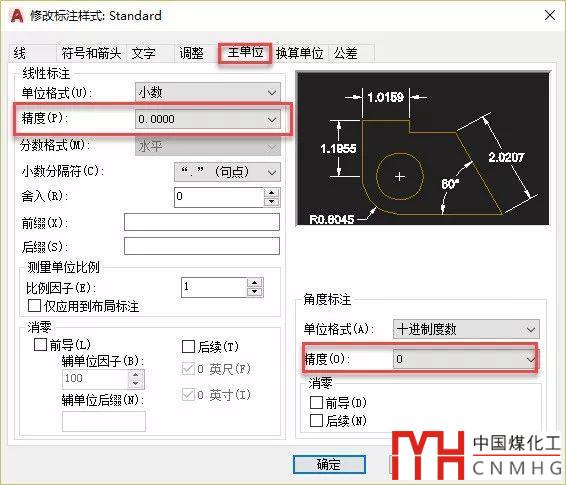 我們上面說(shuō)的都是長(zhǎng)度單位,他控制坐標(biāo)、長(zhǎng)度、比例等數(shù)值的精度,在單位對(duì)話框和標(biāo)注樣式中角度有專門的精度設(shè)置,通常都不保留小數(shù),上面截圖中的單位對(duì)話框中我專門標(biāo)記了角度精度參數(shù),在標(biāo)注樣式的主單位有相同的設(shè)置,如下圖所示。