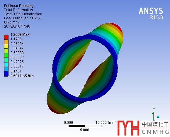 而ANSYS Workbench線性屈曲分析得到的失穩(wěn)臨界壓力為74.252MPa,見(jiàn)下面截圖右下角。對(duì)于我們的模型,數(shù)值解和理論解的誤差在6%左右。