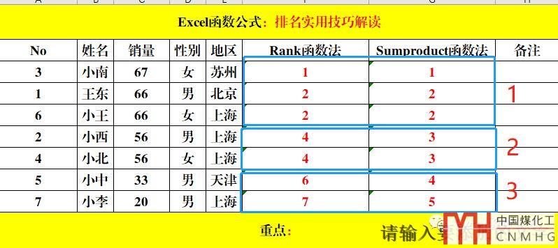 2、函數(shù)Sumproduct的排序,通常稱為“中國(guó)式排名”,暨不會(huì)出現(xiàn)【跳躍】的情況,當(dāng)兩個(gè)或多個(gè)值的名次相同時(shí),下一名次為上一名次+1,名次不會(huì)斷裂,仍然保持連貫數(shù)值。