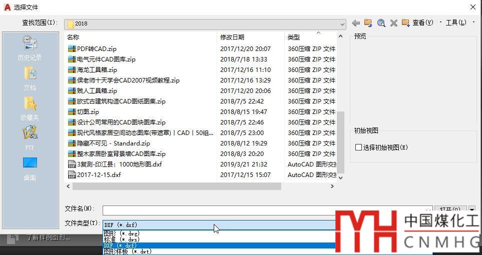 從對(duì)話框中我們可以看到CAD圖紙文件的擴(kuò)展名是*.dwg(drawing的簡(jiǎn)寫(xiě)),CAD圖紙還有一種常用的格式我們必須知道,那就是*.dxf,因?yàn)槲覀儚木W(wǎng)上下載的或別人傳給我們的可能就是DXF文件。因?yàn)閷?duì)話框默認(rèn)的文件類(lèi)型是DWG,DXF文件是不會(huì)顯示到文件列表中的。我們需要將文件類(lèi)型設(shè)置為DXF,才能在列表中看到DXF文件,如下圖所示。