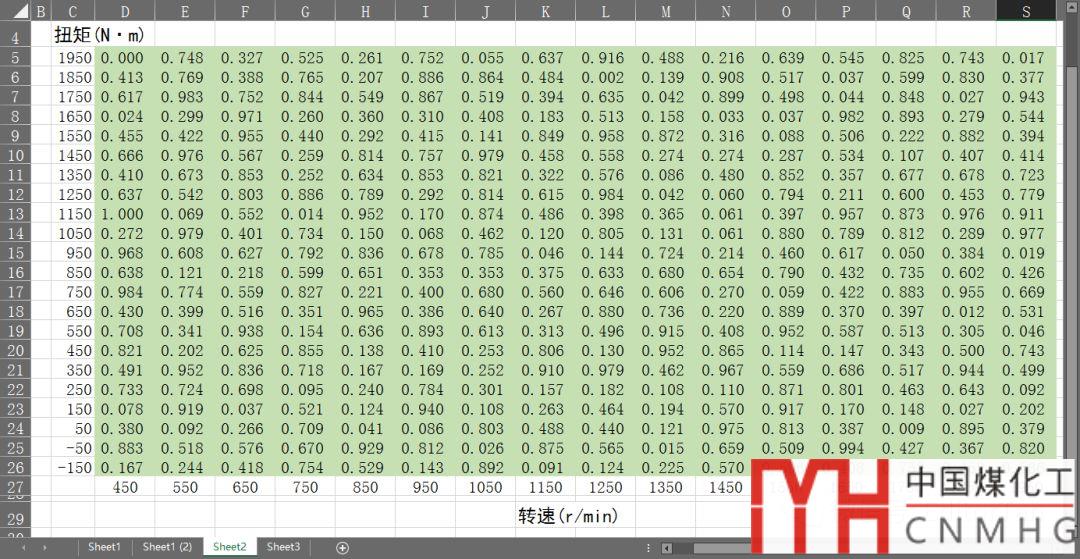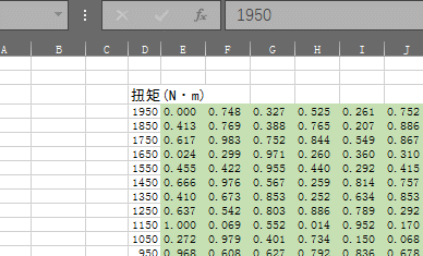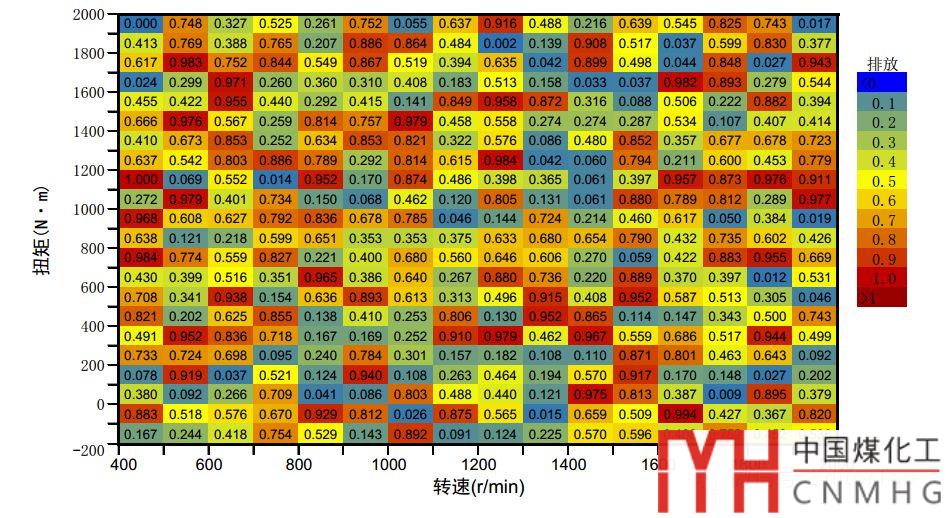 研究轉(zhuǎn)速(r/min)、扭矩(N·m)兩個因子的增加,繪制發(fā)動機(jī)排放分布情況(ps:是不是汽車年檢!)。數(shù)據(jù)表格如下圖。