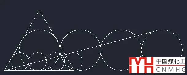 2、先利用相切相切半徑(TTR)方式繪制了一個(gè)跟底邊和左邊相切,但半徑隨意的圓,然后利用捕捉圓的象限點(diǎn)復(fù)制了另外三個(gè)相切的圓,然后從三角形左下角畫(huà)了一條跟第四個(gè)圓相切的線(xiàn),然后利用這條線(xiàn),用相切、相切、相切的方式就畫(huà)出了圓。( 在視頻中用的是三點(diǎn)3p,然后每個(gè)點(diǎn)輸入TAN來(lái)捕捉切點(diǎn)的方式,在CAD高版本的菜單和工具欄中直接提供了相切相切相切的畫(huà)圓方式,更簡(jiǎn)單一點(diǎn),不用輸入三個(gè)TAN了)