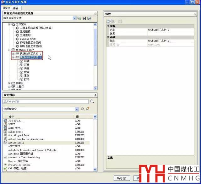 將上面的對(duì)話框展開,或者執(zhí)行CUI命令打開完整的自定義界面對(duì)話框,我們可以新建快速訪問(wèn)工具欄,并且可以在不同的工作空間使用不同的快速訪問(wèn)工具欄,如下圖所示。