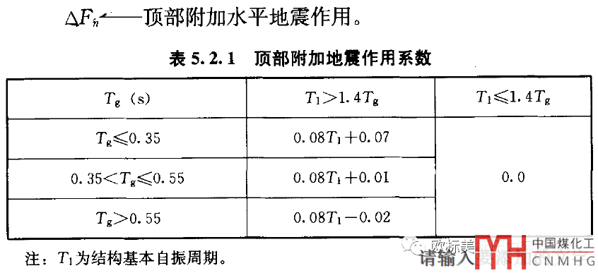 假設(shè)我們查到的設(shè)備操作狀態(tài)下的頻率為1.53HZ,那么其基本的自振周期T1=1/1.53=0.6536s<1.4Tg=0.77s。再根據(jù)GB 50011的表5.2.1可知頂部附加地震作用系數(shù)為0。