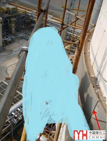 上圖:設(shè)備不僅保溫鋁皮脫落,而且塔身加強(qiáng)圈還發(fā)現(xiàn)多處裂紋。
