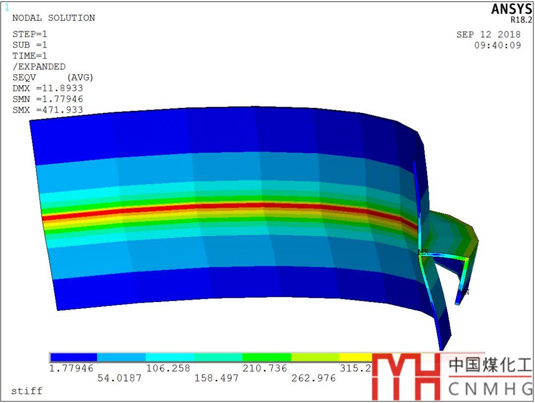 最大熱應(yīng)力為:472MPa,最大應(yīng)力在設(shè)備內(nèi)壁,雖然熱應(yīng)力屬于二次應(yīng)力,但是當(dāng)應(yīng)力值很大時(shí),還會(huì)造成非常大的危害,具體需要應(yīng)力評(píng)定再做判斷。