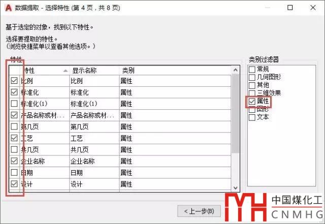 這一頁就跟LI查詢時一樣,還是列出了好多的數(shù)據(jù)。為了過濾這些數(shù)據(jù),在對話框右側(cè)提供了類別過濾器,左側(cè)則列出了此類的所有特性。大多數(shù)數(shù)據(jù)是我們不關心的,只關心屬性文字,在右側(cè)了列表中勾選“屬性”,左側(cè)列表中就列出了圖塊的所有屬性,勾選我們要提取的那些屬性,如圖所示。