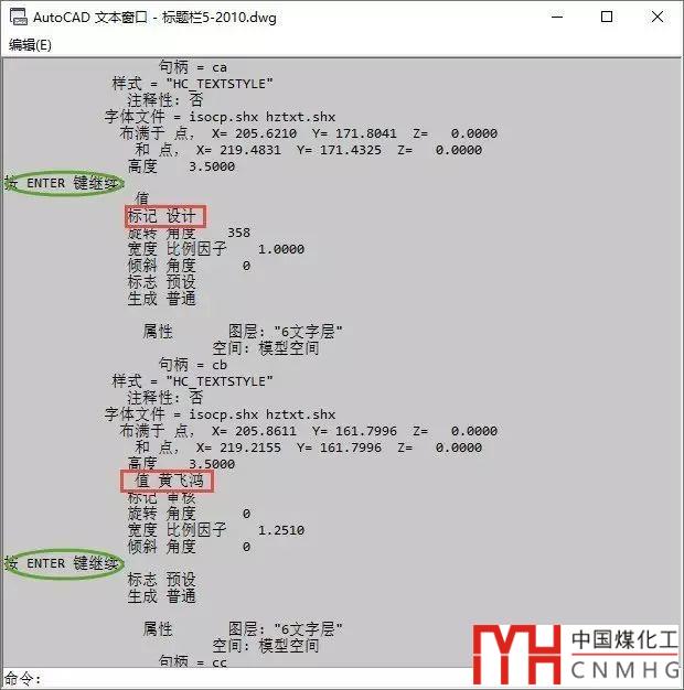 如果要提取更復雜圖形的數(shù)據(jù)就沒那么方便了,假設我們要提取一個屬性塊(如果圖框的標題欄中)的數(shù)據(jù),用LI查詢顯然就不行了。輸入LI后,你可能需要回車多次才能將圖塊的數(shù)據(jù)都顯示出來,而且屬性的標記和值之間都會隔好多行,要摘出來可不容易,如圖所示。