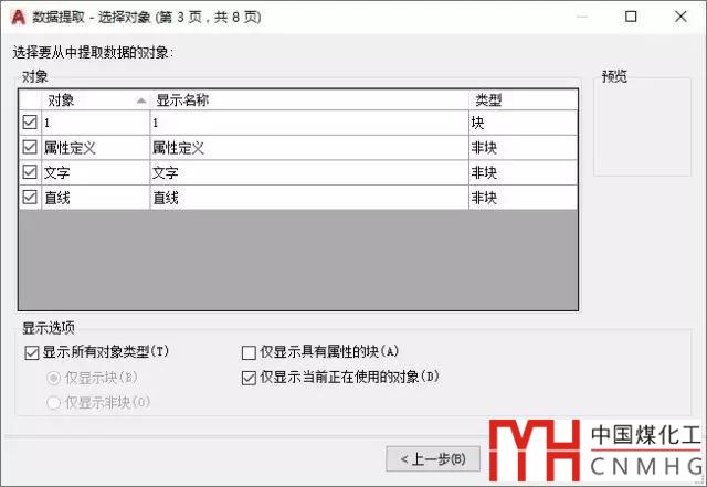 第三頁中會列出選擇圖形中包含的圖形類型,例如我選擇的圖塊中包含圖塊本身、屬性文字、文字、直線。當我們選擇的對象類型比較多時,還可以在下面的顯示選項中選擇只顯示塊、非塊、屬性快等。