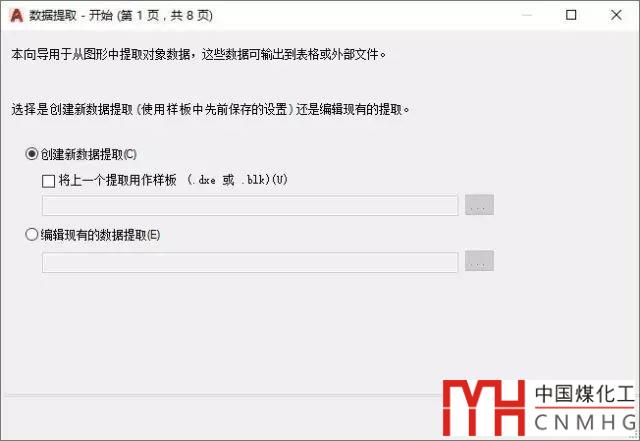 執(zhí)行數(shù)據(jù)提取命令后,會彈出一個操作向?qū)?,指引我們一步步完成操作。首先彈出的是第一頁,可以?chuàng)建新的數(shù)據(jù)或編輯現(xiàn)有數(shù)據(jù),在創(chuàng)建新數(shù)據(jù)提取的時候可以用以前提取的數(shù)據(jù)作為樣板。