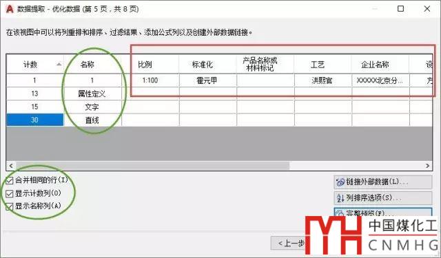在這一頁中將我們提取的數(shù)據(jù)都列出來。前兩列是圖形的計數(shù)和名稱,就是圖形的數(shù)量和類型,后面各列是各種屬性和屬性值。我們可以看到圖塊中有13個屬性、15個文字、30根直線,如果這些數(shù)據(jù)不需要,我們在單擊“上一頁”按鈕返回第3頁,將屬性、文字、直線去掉,然后再返回到第5頁。在底部,還可以設置是否要名稱和數(shù)量這兩列。此外還可以鏈接外部數(shù)據(jù)、排序和預覽,如圖所示。