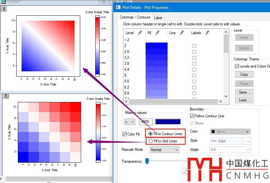重點關(guān)注的時下面的Color Fill選項,去掉勾選圖形會變成一片白;改選為Fill to Contour Lines會變成Contour圖;選擇Fill to Grid Lines則是Heatmap。不信?你自己試試看。