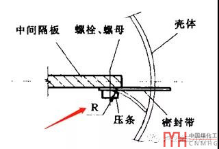 若換熱器雙殼程縱向隔板密封不嚴(yán),會(huì)導(dǎo)致殼程之間介質(zhì)短路,換熱效果達(dá)不到設(shè)計(jì)要求。殼程隔板的密封包括其與管板、殼程筒體兩處,隔板與管板多采用焊接,隔板與殼程筒體多采用密封條,參考文獻(xiàn)介紹了一個(gè)密封條設(shè)計(jì)不合理導(dǎo)致泄漏的實(shí)例及其改進(jìn)措施,可供我們借鑒,加工整理如下: