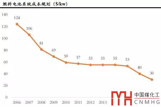 美國能源部對燃料電池汽車的成本進行了預估,當年產量為10萬臺是,成本在60美元/kw,當年產量達到50萬臺時,成本可降低至53美元/kw。同樣,在年產量2萬臺時,整車成本在4.8萬美元,當產量達到20萬臺,整車成本可下降至3.7萬美元,預計到2020年,鄭晨成本降至3萬美元左右,不過3萬美元/臺這一推斷值得懷疑。
