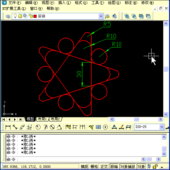 這張圖看著好熱鬧啊,仔細(xì)研究一下的話也不難。常規(guī)的思路是畫(huà)一個(gè)30邊長(zhǎng)的正五邊形,然后延伸各條線變成五角星,然后用圓角F命令來(lái)畫(huà)5和10的圓角,外面的圓用相切相切半徑來(lái)畫(huà)圓。