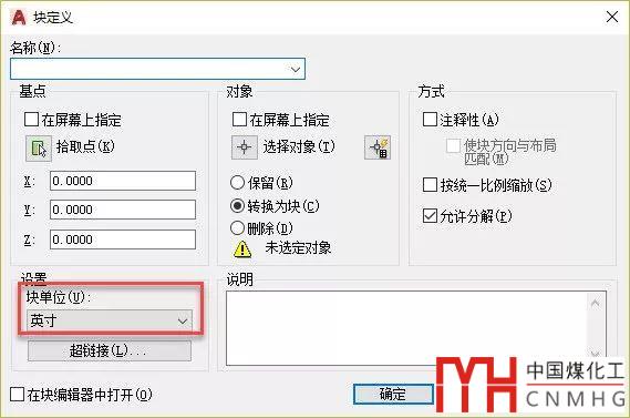 如果希望圖塊有特定的尺寸,并且在插入到不同單位的圖紙時尺寸保持不變的話,定義圖塊時可以設(shè)置塊單位。默認狀態(tài)下,塊單位跟當(dāng)前圖紙的插入時的縮放單位是一致的。如果當(dāng)前圖紙被設(shè)置為無單位或者跟圖塊需要的單位不同,創(chuàng)建圖塊時可以修改塊單位,如下圖所示。
