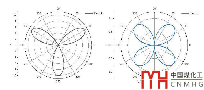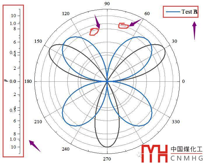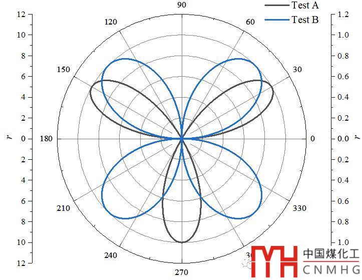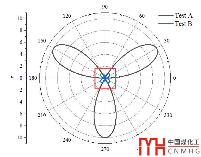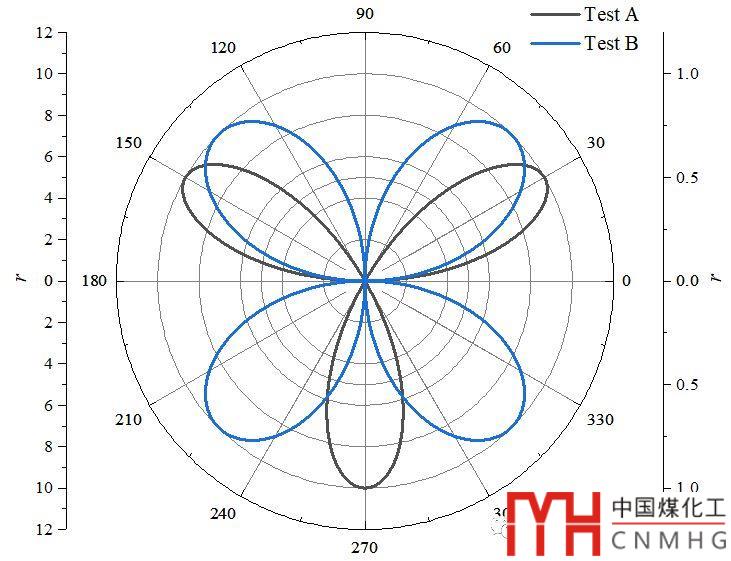 如下圖所示,Test A和Test B的數(shù)據(jù)相差較大,放在一個極坐標(biāo)圖中不能清楚的表面Test B的變化趨勢及范圍,更重要的是,這個圖不好看。