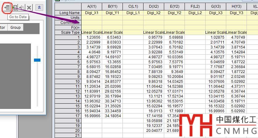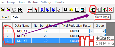 單擊 Go to Data 按鈕跳轉(zhuǎn)到數(shù)字化生成的數(shù)據(jù)列表,可見對應(yīng)的三組數(shù)據(jù)。