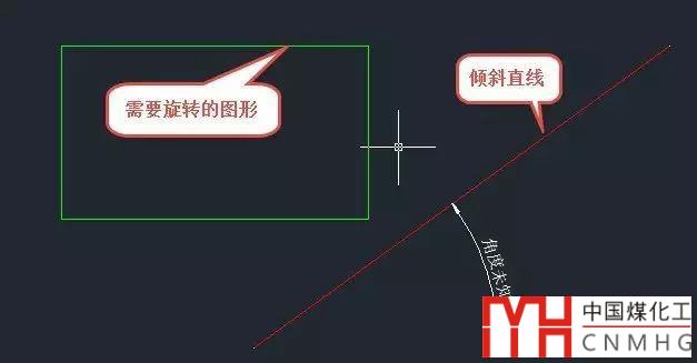 假設像上圖一樣,矩形和直線不在一起,但我們希望以矩形某個角點為基點進行旋轉,我們可以將傾斜的直線復制一條到矩形的角點處,如下圖所示。