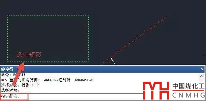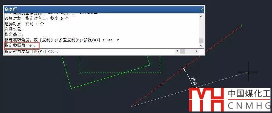 輸入R回車,軟件會提示輸入?yún)⒄战?,默認角度為0,也就是水平方向,因為矩形是水平的,我們可以直接回車,軟件會提示輸入新角度,如下圖所示。