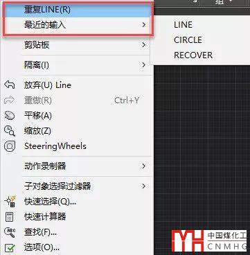 如果在圖形窗口中右鍵設(shè)置成顯示快捷菜單,不僅可以重復(fù)剛執(zhí)行的命令,右鍵菜單中還會顯示最近執(zhí)行的命令,可以選擇執(zhí)行其中某一個(gè)命令,如下圖所示。