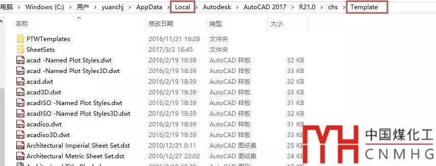 CAD大部分支持文件都放在當(dāng)前用戶的AppDataRoamingAutodeskAutoCAD 2017R21.0chsSupport目錄下,但模板文件有些不一樣,放在AppDataLocalAutodeskAutoCAD 2017R21.0chsTemplate目錄下,如下圖所示。