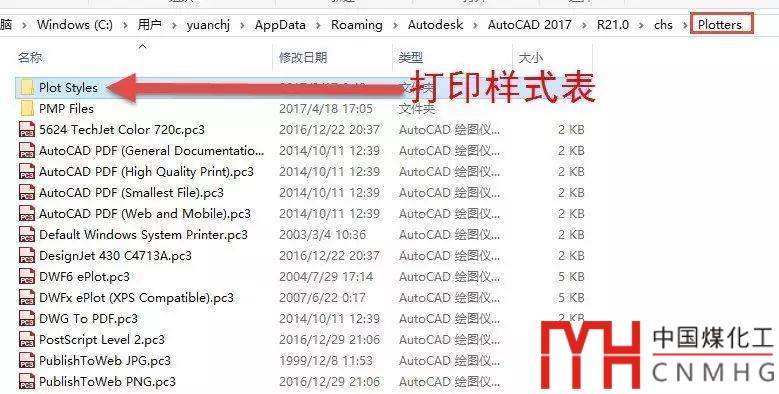 打印相關(guān)的文件非常多,重新設(shè)置起來相對比較麻煩,尤其是打印樣式表CTB/STB文件,因此在重裝之前還是有必要備份一下。與打印相關(guān)的文件有打印驅(qū)動文件*.pc3、自定義紙張文件*.PMP,這些文件都在APPDATA中CAD的PLOTTERS目錄下,如下圖所示。