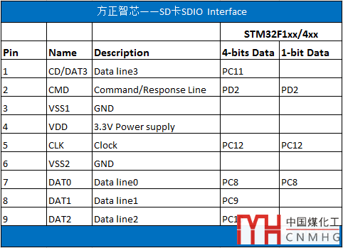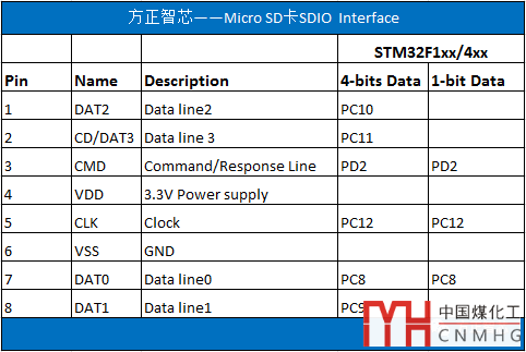 下面這張表,是SD卡在SD模式(SDIO)下的引腳定義,右邊的兩欄是STM32F1xx/4xx系列單片機(jī)的引腳,“4-bits Data”表示“四位數(shù)據(jù)傳輸”,“1-bit”表示“一位數(shù)據(jù)傳輸”: