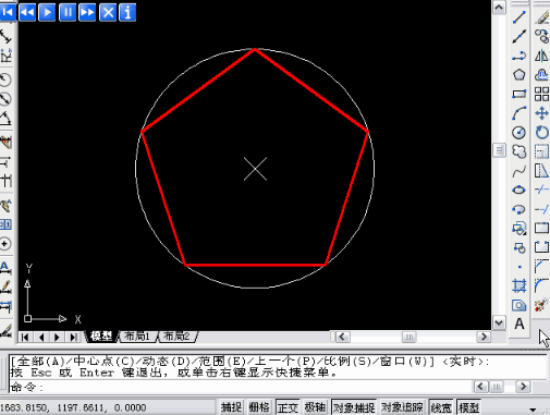 這張圖只給出了一個尺寸:100,感覺無從下手。但這種圖必須要弄清楚隱含的條件,外圍是正五邊形不必說了,那條圓弧與五邊形的邊垂直,隱含就是兩端都垂直,那圓心就在這兩條邊上,延長就可以得到圓心。另外一條圓弧可以偏移得到,不過位置是通過五邊形的中點(diǎn)的。另外這個圖形是中心對稱的,最下面的圓除和兩條圓弧相切外,圓心應(yīng)該在中間的對稱軸上,確定了這一個圓,其他圓就簡單了。