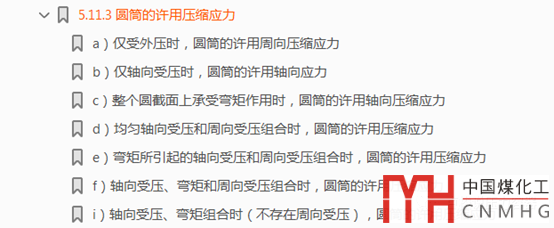 不過,新的“壓力容器-分析設(shè)計(jì)”標(biāo)準(zhǔn)(征求意見稿)在其第3部分“典型受壓元件及結(jié)構(gòu)”的5.11.3一節(jié)中(見下面的書簽截圖),給出了不同載荷組合下圓筒的局部失穩(wěn)、柱狀失穩(wěn)時(shí)的許用軸向壓縮應(yīng)力,可供參考。這部分內(nèi)容應(yīng)該是來自ASME VIII-2的4.4.12 Combined Loadings and Allowable Compressive Stresses。