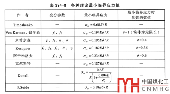 對(duì)于彈性失穩(wěn)(即A-B曲線的斜線段)有:B=2AEt/3,將上述A計(jì)算式代入有B=0.0626Etδe/Ro,大致相當(dāng)于Timoshenko(鐵木辛柯)小撓度理論解(見下面的標(biāo)準(zhǔn)釋義截圖)取安全系數(shù)10.0,也近似相當(dāng)于Kernpner(凱譜涅爾)大撓度理論解取安全穩(wěn)定系數(shù)3.0。
