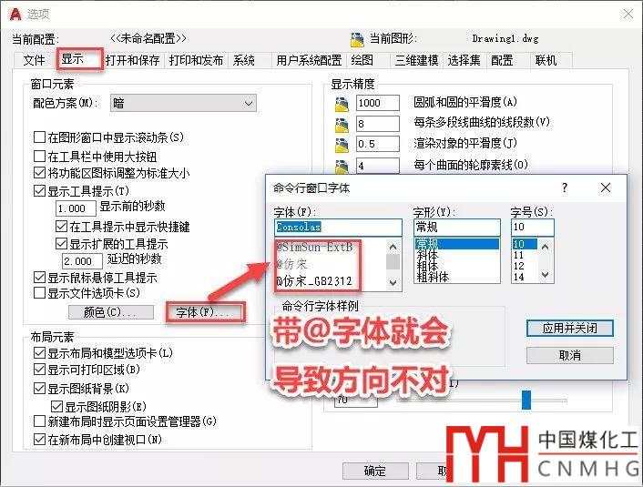 CAD命令行的字體是可以設(shè)置的,WINDOWS的字體有兩種,一種是常規(guī)的用于橫向文字,一種是用于豎向排列文字的,這種字體名稱前面帶一個(gè)@號(hào)。這種情況就是將字體設(shè)置成了@的字體,如果字體被設(shè)置成了不支持中文的字體,命令行還會(huì)顯示為亂碼。