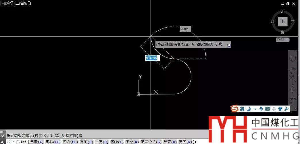 4、向上拖動(dòng)光標(biāo),當(dāng)光標(biāo)為豎直方向時(shí)輸入10,創(chuàng)建一個(gè)半圓,然后拖動(dòng)光標(biāo),可以看到還可以繼續(xù)繪制弧線(xiàn)段,如圖所示。