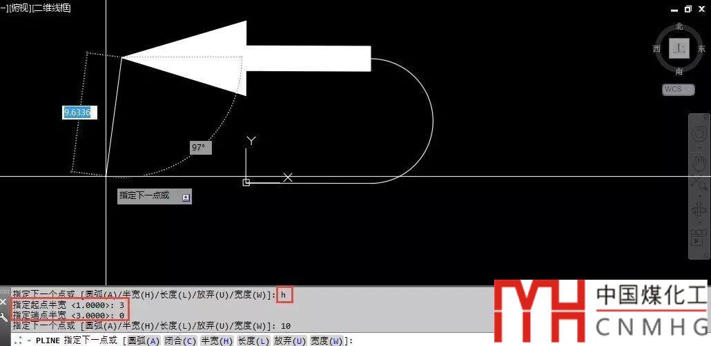 7、輸入H,回車(chē),同樣會(huì)提示起點(diǎn)半寬因?yàn)橹拜斎氲膶挾仁?,這里半寬的默認(rèn)值顯示為1)。輸入3,回車(chē),提示輸入端點(diǎn)半寬時(shí)輸入0,回車(chē),這樣就可以得到一個(gè)箭頭,水平拖動(dòng)光標(biāo),輸入10,繪制一個(gè)寬度為6,長(zhǎng)度為10的箭頭,如圖所示。