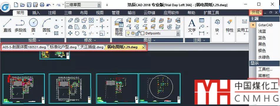國(guó)產(chǎn)CAD比AUTOCAD更早就添加了文件選項(xiàng)卡,比如浩辰CAD的文件選項(xiàng)卡也可以在選項(xiàng)卡里開關(guān),還可以在外觀下拉菜單里設(shè)置,如下圖所示。