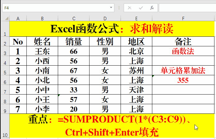 如果將SUM函數(shù)的計算結(jié)果:298+57=355。正好是全部銷量之和。