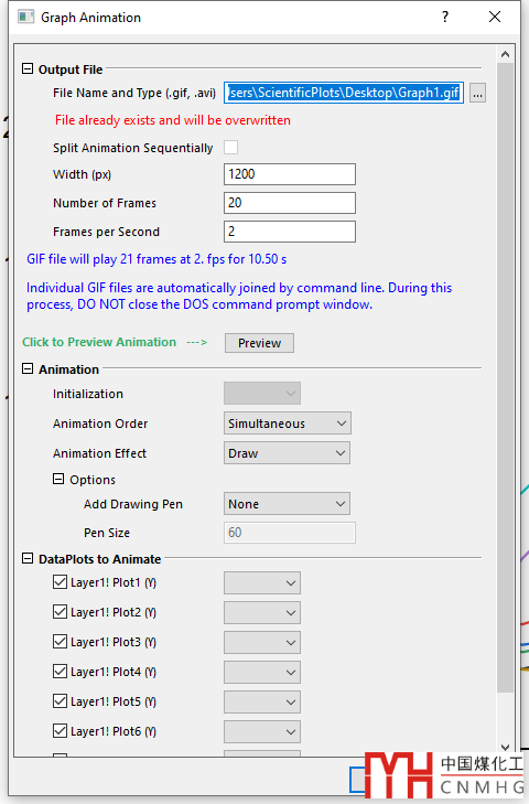 繪制好圖形,打開(kāi)Graph Anim插件,設(shè)置相應(yīng)的Output File、Animation、Dataplots to Animate等選項(xiàng),點(diǎn)擊Preview預(yù)覽結(jié)果,點(diǎn)擊OK自動(dòng)導(dǎo)出為動(dòng)圖或者視頻。