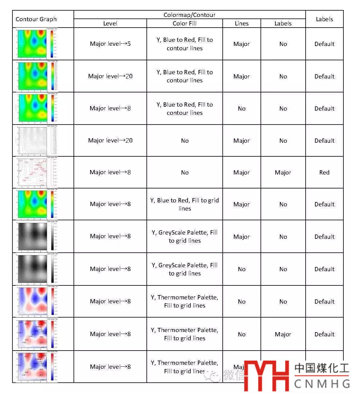 Contour圖的幾種類型:Color fill,B/W lines+Label,Grey Scale Map和Heatmap幾種形式(極坐標(biāo)Contour圖和三元Contour圖除外,后續(xù)會(huì)介紹),通過(guò)一定的格式設(shè)置,幾種圖形可以相互轉(zhuǎn)化。