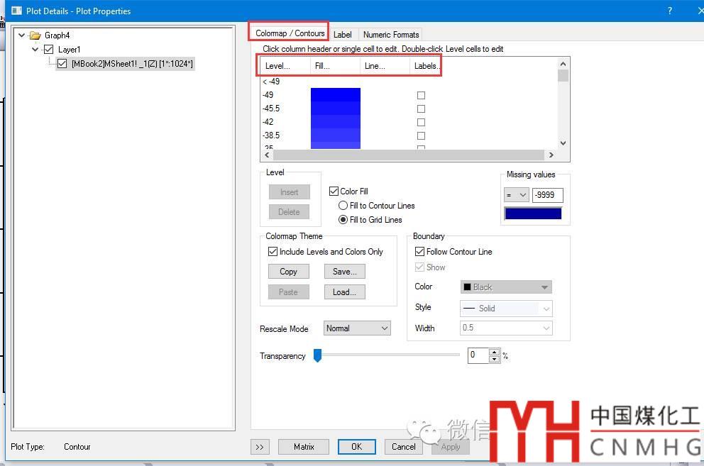 Colormap/Contours選修卡:與三維圖的設(shè)置基本類似,包括Level,Fill,Lines和Labels幾項(xiàng)。