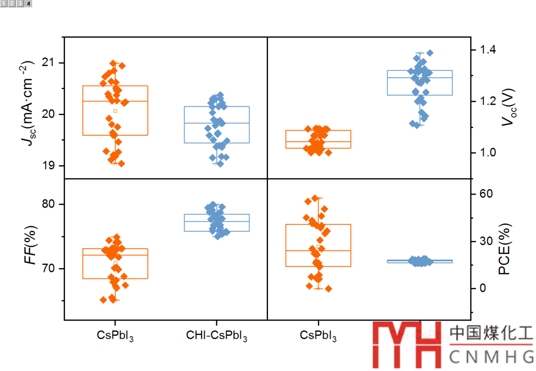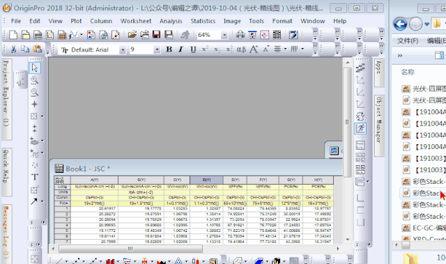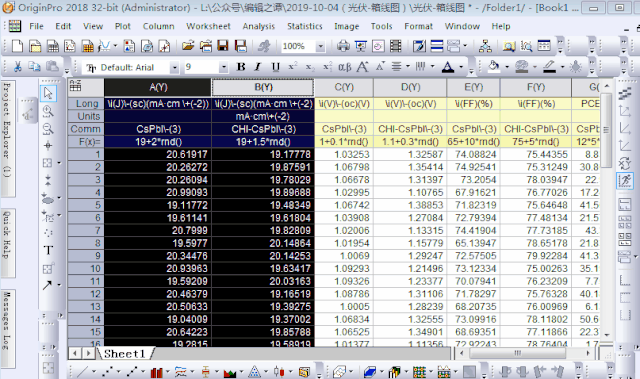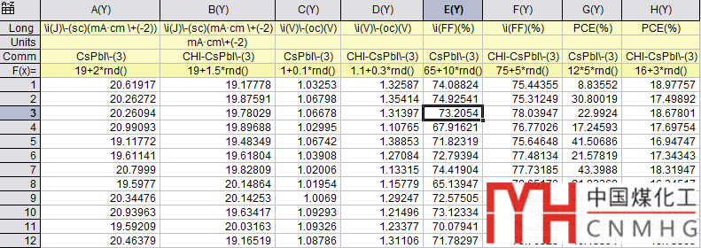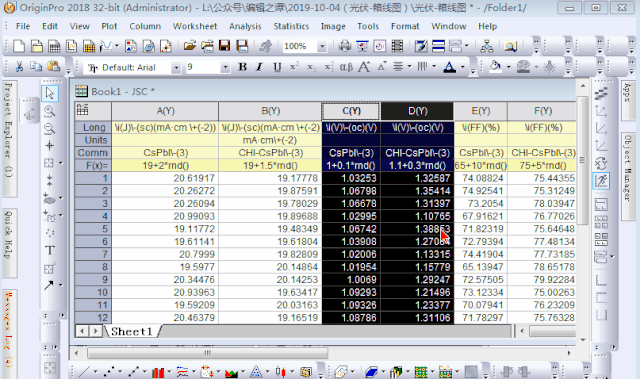 準(zhǔn)備一張數(shù)據(jù)表,刪除X列,全部是Y列。分別是CSPbI3和CHI-CsPbI3的Jsc、Voc、FF、PCE的數(shù)據(jù)。