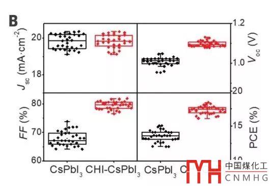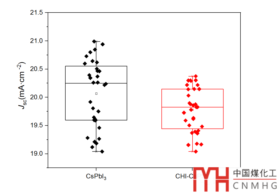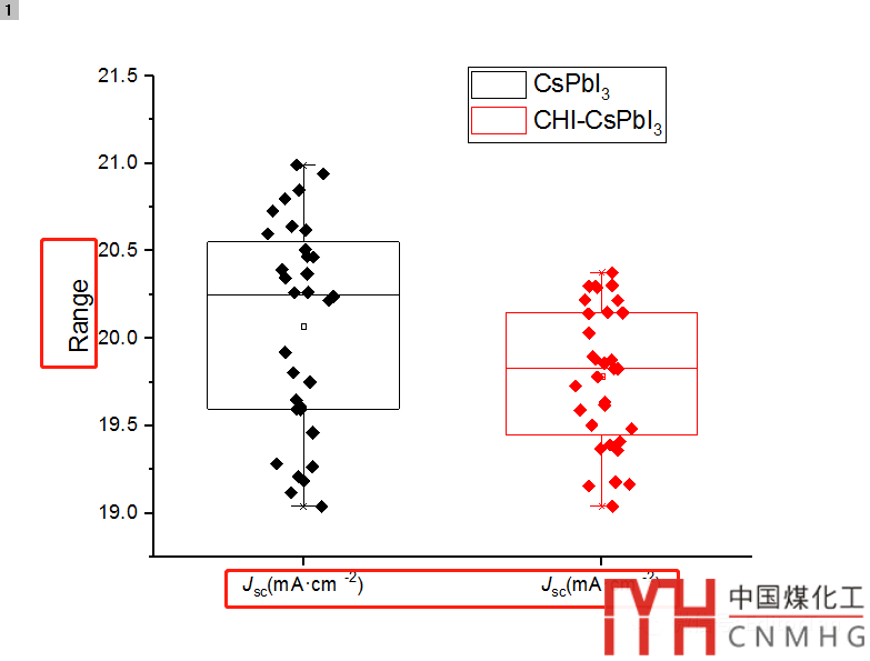 但是,這里縱軸、橫軸標(biāo)題并不是我們想要的,我們需要將縱軸標(biāo)題改為Jsc(mA·cm-2),橫軸刻度標(biāo)簽改為CsPbI3和CHI-CsPbI3.
