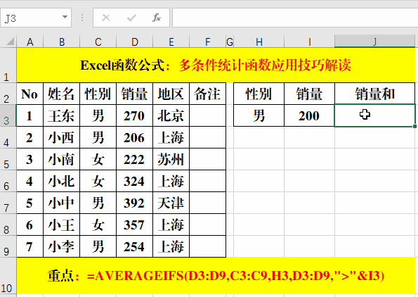 在目標(biāo)單元格中輸入公式:=AVERAGEIFS(D3:D9,C3:C9,H3,D3:D9,">"&I3)。