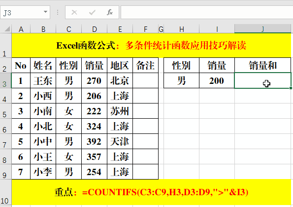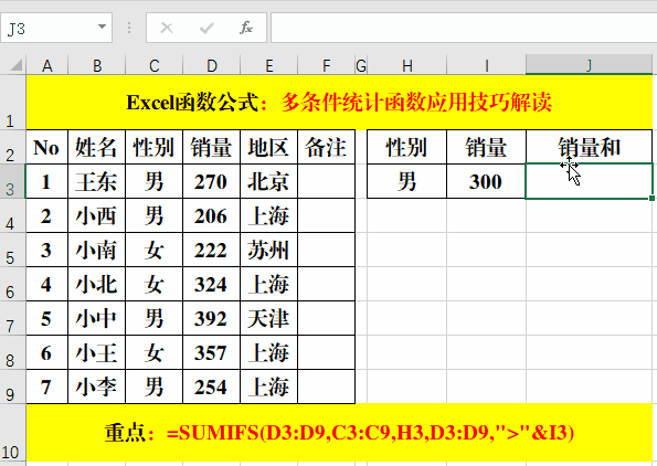 在目標(biāo)單元格中輸入公式:=SUMIFS(D3:D9,C3:C9,H3,D3:D9,">"&I3)。