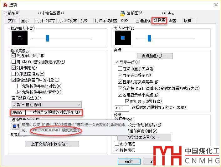 在AUTOCAD 2018中,對象數(shù)量的默認(rèn)限制是25000,也就是選定對象超過25000個時就不再處理對象特性。這個數(shù)量是由一個變量控制的,可以在選項OP對話框的選擇集選項卡中設(shè)置,如下圖所示。
